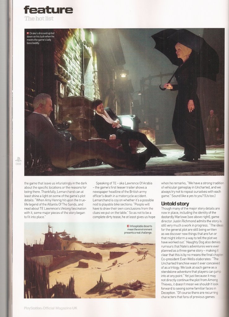 В сети появилась парочка сканов из журнала Official PlayStation Magazine UK, на страницах которого во всем своем великолепии фигурирует знакомый нам до боли Дрейк со своим закадычным другом Салли. Глядя на сканы, до сих пор остается большой загадкой один вопрос. Кто же так смог избить двух наших друзей? Ведь Натан попадал и не в такие передряги, а потом без особых проблем выбирался из них.
